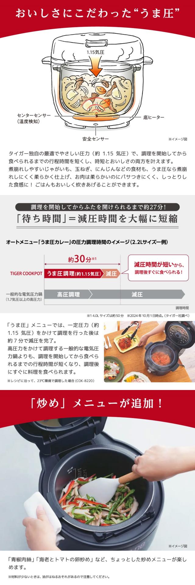 一般的な電気圧力鍋は1.7気圧以上の高圧力をかけて調理しますが、TIGER COOKPOTはやさしい圧力(約1.15気圧)で、調理を開始してから食べられるまでの行程時間を短くしました。