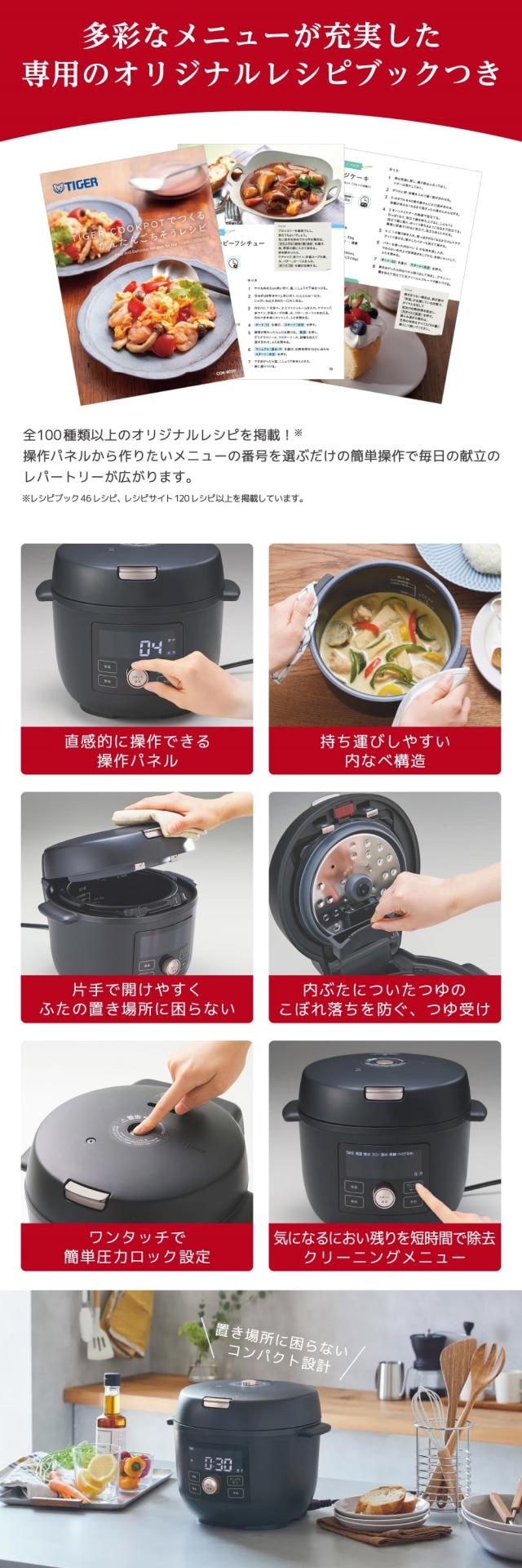 ・その他調理:1.4L。【特典付】[ Re・De Pot 電気圧力鍋 2L EPC01A-20 ]リデポット 電気 圧力鍋 炊飯 4合 圧力調理 低温調理 無水調理 蒸し料理 1.2L 保温 手軽 時短 コンパクト 菌活 腸活 発酵 おしゃれ 調理家電 鍋 電気調理鍋 電気圧力調理鍋 炊飯器 圧力炊飯器 電気炊飯器 無水調理鍋。COK-B220KM TIGER マットブラック TIGER COOKPOT(タイガークックポット) [電気圧力鍋 (1.4L)]。COK-B220WM TIGER マットホワイト TIGER COOKPOT(タイガークックポット) [電気圧力鍋 (1.4L)]。TIGER COK-B220WM マットホワイト TIGER COOKPOT(タイガークックポット) [電気圧力鍋 (1.4L)]。TIGER COK-B220KM マットブラック TIGER COOKPOT(タイガークックポット) [電気圧力鍋 (1.4L)]。T-fal CY8708JP ブラック クックフォーミー [電気圧力鍋(3L)]。T-fal CY8708JP ブラック クックフォーミー [電気圧力鍋(3L)]。タイガー魔法瓶 TIGER 電気圧力鍋 TIGER COOKPOT マットブラック 4L COK-B400(KM)。E0234YO ◆1212【美品】電気圧力鍋 2.3L 1〜2人用 ティファール CY3401JP 1台10役 時短 自動調理。E0244YO ◆1212【アウトレット品】電気圧力鍋 2.3L 1〜2人用 ティファール CY3401JP 1台10役 時短 自動調理。アイリスオーヤマ PC-MA4-W ホワイト [電気圧力鍋(4.0L)] メーカー直送。【在庫有・即納】アイリスオーヤマ 電気圧力鍋 圧力鍋 3L 炊飯器 鍋 108種類うち52種類のヘルシーメニュー搭載 1台9役 1〜4人用 液晶タイプ KPC-MA3-H グレー。【新品】IRIS OHYAMA アイリスオーヤマ 電気圧力鍋 低温調理予約機能付き 4.0L ホワイト PC-MA4-W。アイリスオーヤマ PC-MA4-W ホワイト [電気圧力鍋(4.0L)] メーカー直送。【在庫有・即納】 アイリスオーヤマ(IRIS OHYAMA) 電気圧力鍋 3L 液晶タイプ KPC-MA3-B ブラック。ティファール ラクラ・クッカー コンパクト電気圧力鍋 CY3511JP T-fal 1〜2人分 クッカー 圧力鍋 全自動調理 圧力調理 電気鍋 鍋 コンパクト。タイガー魔法瓶 TIGER 電気圧力鍋 TIGER COOKPOT マットホワイト 2.2L COK-B220(WM)。選べる2大特典 電気圧力鍋Re・De Pot リデポット 2L EPC01A-20 炊飯器 ほったらかし レシピ本付き 3合 4合 炊き 低温調理 ih 予約 おいしい 白米 一人暮らし 玄米 1人用 無水調理 小型 タイマー機能 小さい おしゃれ